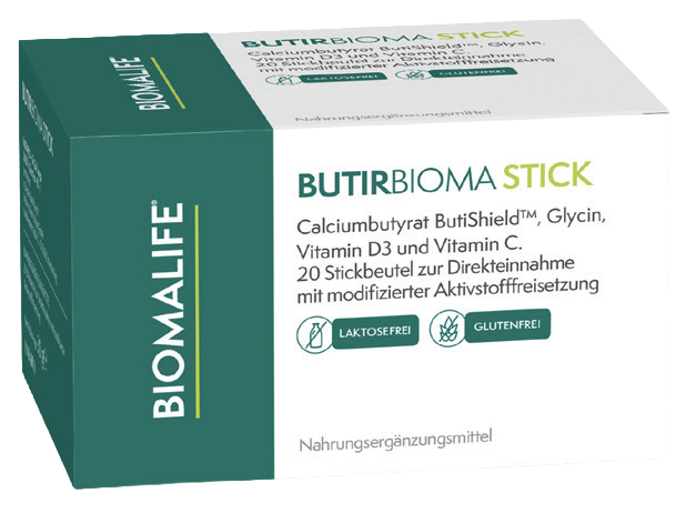 Nahrungsergänzungsmittel auf der Basis von Calciumbutyrat ButiShieldTM, Glycin, Vitamin D3 und Vitamin C. Stickbeutel zur Direkteinnahme mit modifizierter Aktivstofffreisetzung.